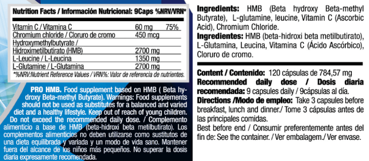 حاوی HMB (β-هیدروکسی-ب متیل بوتیرات)، یک ترکیب طبیعی مشتق شده از لوسین، اسید آمینه شاخه دار BCAA است که به کاهش تخریب فیبر عضلانی کمک می کند و سنتز پروتئین را از طریق مسیر mTOR تحریک می کند.