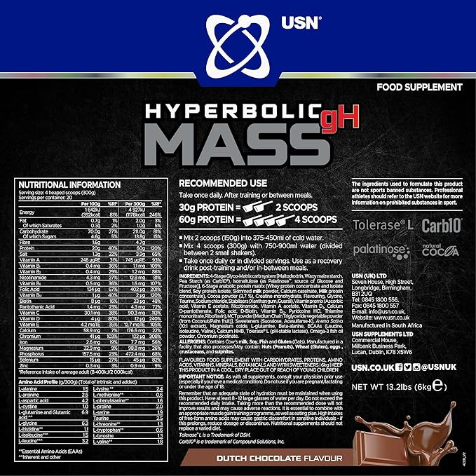 هایپربولیک مس USN یک افزایش دهنده وزن همه کاره است که برای افرادی با متابولیسم سریع طراحی شده است. این محصول یک ماتریس کربوهیدرات و پروتئین با کیفیت بالا، غنی از BCAA، کراتین، پروتئین وی، اسیدهای آمینه و گلوتامین را فراهم میکند. در USN، ما فقط از بهترین پروتئین وی با کیفیت در فرمولاسیون مکملهای غذایی خود استفاده میکنیم تا به پشتیبانی از حداکثر رشد عضلات کمک کنیم. برای اطمینان از ترمیم و رشد عضلات شما برای پشتیبانی از سبک زندگی فعال، بدن شما هر روز به مقدار سالمی پروتئین نیاز دارد. بعد از تمرین یا به عنوان میان وعده بین وعدههای غذایی استفاده شود. • حاوی 6 کیلوگرم پودر پروتئین افزایش دهنده وزن پرکالری USN Hyperbolic Mass - طعم شکلات هلندی با استفاده از مواد اولیه با بالاترین کیفیت، محصولات علمی مرتبط و آزمایشگاههای مستقل برای آزمایش کیفیت، عملکرد ورزشی، کنترل وزن و مکملهای عضله سازی USN، در کنار محصولات سلامتی، نوشیدنیها و بارها، سنگ بنای ارائه محصولات برتر ما بودهاند. طیف کاملی از فرمولهای جایگزین وعدههای غذایی، شیکهای پروتئینی، پودرهای پروتئین وی و مکملهای قبل از تمرین و بعد از تمرین USN را کشف کنید. همیشه قبل از مصرف مکملهای تناسب اندام با یک متخصص مراقبتهای بهداشتی مشورت کنید. در صورت بارداری، سالمندی یا زیر ۱۸ سال از مصرف آن خودداری کنید. از میزان مصرف توصیه شده روزانه تجاوز نکنید. مکملهای غذایی نباید جایگزین یک رژیم غذایی متنوع و متعادل و سبک زندگی سالم شوند.