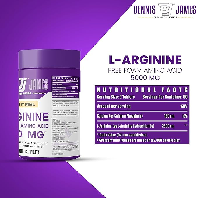 Dennis James Signature Series L-Arginine 5000mg. این فرمول با کیفیت بالا برای کمک به ساخت توده عضلانی بدون چربی و بهبود قدرت و استقامت کلی شما طراحی شده است.