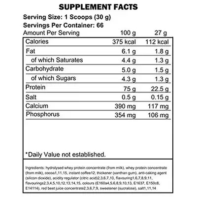 مواد تشکیل دهنده: کنسانتره پروتئین آب پنیر هیدرولیز شده (از شیر )، کنسانتره پروتئین آب پنیر (از شیر )، کاکائو 1،11،15 ، قهوه فوری 12 ، غلیظ کننده (صمغ زانتان)، عامل ضد تشکیل (دی اکسید سیلیکون)، تنظیم کننده اسیدیته (اسید سیتریک) ) 2،3،6،7،10 ، طعم دهنده 1،6،7،8،9،11 ، طعم دهنده ها 2،3،4،5،10،12،13،14،15 ، رنگ ها (E160a 4،5،6،8،9،10،13 ، E163 7 , E150c 8 , E141 14 ), کنسانتره آب چغندر قرمز 2,3,6,7,9 ، شیرین کننده (سوکرالوز)، نمک 1،11،14 .