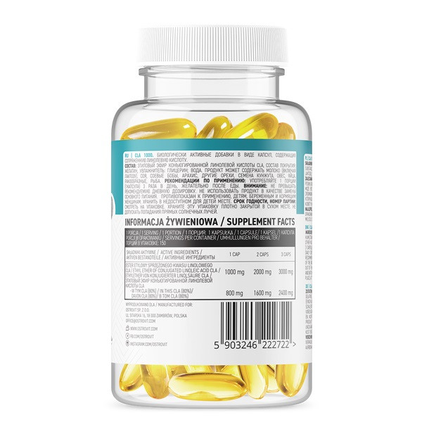 CLA اغلب به عنوان یک مکمل کاهش وزن، و همچنین برای حفظ توده عضلانی بدون چربی، حفظ کاهش وزن و حتی کمک به جلوگیری از دیابت نوع 2، که اغلب با چاقی مرتبط است، استفاده می شود.OstroVit CLA 1000 از رشد توده عضلانی بدون چربی حمایت می کند و به سوزاندن بافت چربی غیر ضروری کمک می کند. CLA یک آنتی اکسیدان بسیار قوی است – حدود 100 برابر بیشتر از ویتامین E فعالیت آنتی اکسیدانی نشان می دهد که به لطف آن به مهار تشکیل رادیکال های آزاد کمک می کند و پیری بدن را به تاخیر می اندازد. علاوه بر این، CLA سلامت استخوان را بهبود می بخشد و توانایی عادی سازی سطح گلوکز در خون را دارد.