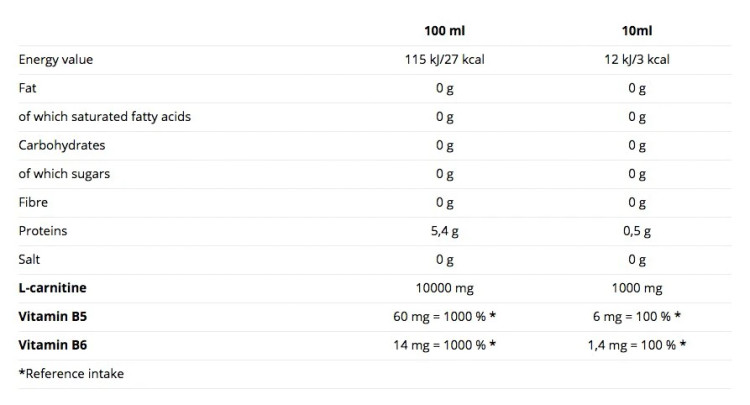آب، ال کارنیتین، تنظیم کننده اسید سیتریک و اسید مالیک، امولسیون لیمو (عطر، عامل رنگی E-104 - ممکن است اثر نامطلوبی بر فعالیت و توجه در کودکان داشته باشد)، نگهدارنده سوربات پتاسیم، D-کلسیم پانتوتنات (ویتامین B5) نگهدارنده بنزوات سدیم، شیرین کننده های آسسولفام K و سوکرالوز، پیریدوکسین هیدروکلراید (ویتامین B6)، شیرین کننده استویول گلیکوزیدها.