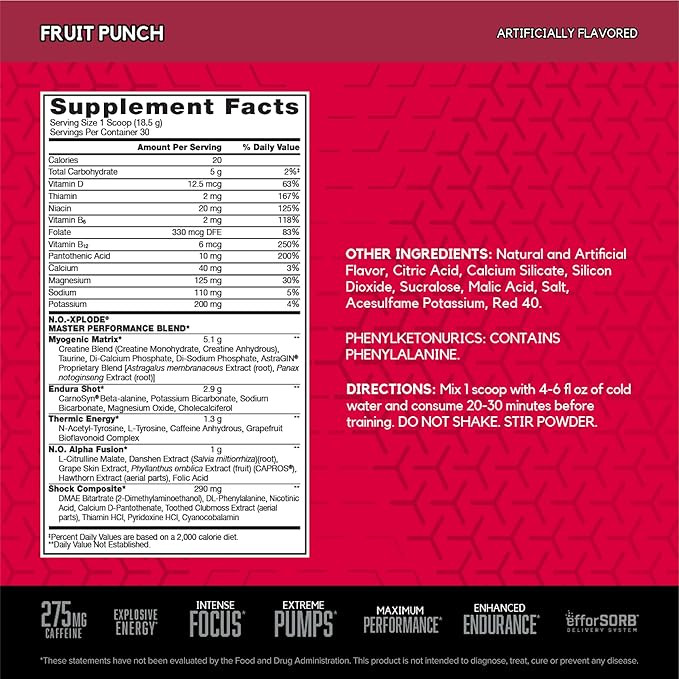 - NO-XPLODE قبل از تمرین فرمول افسانه ای است که ورزشکاران زمانی که می خواهند تمرینات خود را داشته باشند و سر خود را به هر کجا که می روند به آن تکیه می کنند. NO-XPLODE که با فناوری پیشرفته و توقف نمایش برای پشتیبانی از انرژی انفجاری، استقامت افزایش یافته، تمرکز ذهنی و حداکثر شدت طراحی شده است، ترکیب نهایی پمپ قبل از تمرین برای به حداکثر رساندن عملکرد - از شروع تا پایان است.