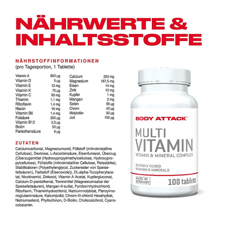 در زندگی روزمره پر استرس و یا در موقعیت های خاص زندگی، ما همیشه نمی توانم نیازهای خود را از طریق رژیم غذایی با ویتامین ها و مواد معدنی تامین کنیم. به منظور جلوگیری از مصرف، میتوان از ویتامین و مواد معدنی بادی اتک مولتی ویتامین استفاده کرد.