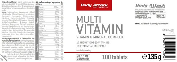 - مولتی ویتامین BODY ATTACK حاوی بیش از 20 ماده مغذی فعال زیستی است که نه تنها برای ورزشکاران بلکه برای هر انسان مدرن مورد نیاز است. علاوه بر تمام ویتامین ها، حاوی کلسیم، منیزیم، آهن، روی، کروم و غیره است .