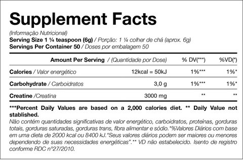 Creatine Turbo® Black Skull Skull Uses Skull Skull یک کراتین مونوهیدرات و مالتودکسترین است. در مواردی که ثابت شده است، استفاده از کربوهیدرات ها همراه با کراتین، اثربخشی بیشتر را افزایش می دهد، علاوه بر اثر کربوهیدرات بر افزایش انرژی، با هدف حمایت از نتایج شما در فعالیت های بدنی، انرژی بیشتر و متوالی بهترین عملکرد را ارائه می دهد. با مزایایی که دارد، از افزایش انبوه و نتیجه گیری تمرین برای حفظ کیفیت تکرارهای شما پشتیبانی می کند. مصرف 6 گرم (1 ¼ قاشق چای خوری) توصیه می شود. مواد تشکیل دهنده: کراتین مونوهیدرات و مالتودکسترین. حاوی گلوتن نباشد.