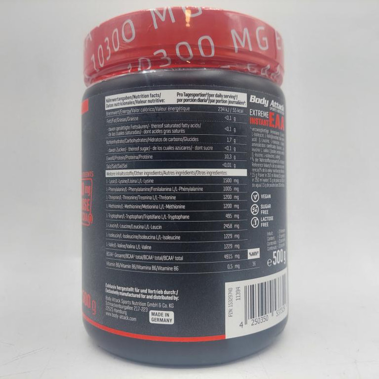 سریعترین بهبودی! از Body Attack Extreme Instant EAA برای تغییر دنده به سمت رشد و نگهداری توده عضلانی استفاده کنید. در طول مرحله رژیم غذایی رشد عضلانی، EAAs مواد مغذی رشد ضروری بدن شما را تامین می کند. پودر فوق ریز Extreme Instant EAA شامل تمام 8 اسید آمینه ضروری ضروری است . به خصوص در مرحله بازسازی، از ترمیم و رشد بافت عضلانی حمایت می کنند. سه BCAA، یعنی لوسین، ایزولوسین و والین به همراه ویتامین B6 که برای متابولیسم مهم است، EAA فوری را کامل میکنند. قبل از تمرین بعدی سریعتر ریکاوری کنید و دیگر هرگز عضلات سخت به دست آمده را از دست ندهید!