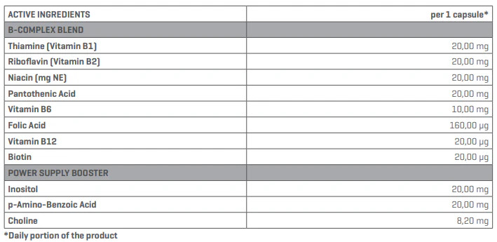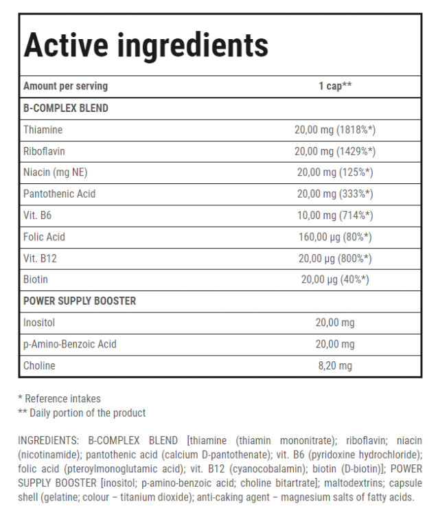 VITAMIN B COMPLEX ترکیبی با بالاترین کیفیت از ریز مغذیها است که برای متابولیسم افراد فعال و ورزشکاران ضروری است. نسبتهای انتخاب شده با دقت مهمترین ویتامینهای گروه B و فعالکنندههای متابولیک به جذب و استفاده مؤثر از تمام مواد مغذی، یعنی پروتئینها، چربیها و کربوهیدراتها کمک میکند. ویتامین B COMPLEX شامل اجزایی است که تولید انرژی را افزایش می دهد و توانایی انطباق بدن را بهبود می بخشد و در عین حال از عملکرد صحیح سیستم عصبی و ایمنی حمایت می کند.