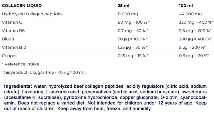 مواد تشکیل دهنده: آب، پپتیدهای کلاژن هیدرولیز شده گوشت گاو، تنظیم کننده اسید (اسید سیتریک، سیترات سدیم)، طعم دهنده، اسید ال اسکوربیک، نگهدارنده ها (اسید سوربیک، بنزوات سدیم)، شیرین کننده ها (اسه سولفام K، سوکرالوز)، پیریدوکسین هیدروکلراید، دی گلولو مس -بیوتین، سیانوکوبالامین جایگزین رژیم غذایی متنوع نمی شود. برای کودکان زیر 12 سال در نظر گرفته نشده است. دور از دسترس کودکان نگهداری شود. دور از گرما، یخ زدگی و رطوبت نگهداری شود.