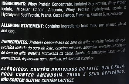 مواد تشکیل دهنده پروتئین سرم شیر غلیظ، پروتئین سویا ایزوله، پروتئین سرم شیر ایزوله، کازئین میسلار، آلبومین، پروتئین سرم شیر هیدرولیز شده، پروتئین هیدرولیز شده گوشت، پودر کاکائو، طعم دهنده ها، زانتان غلیظ کننده و صمغ شیرین کننده سوکرالوز. حاوی گلوتن نیست.