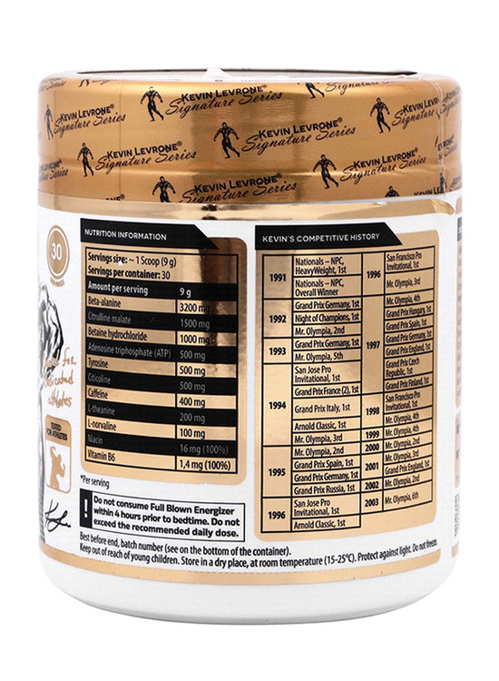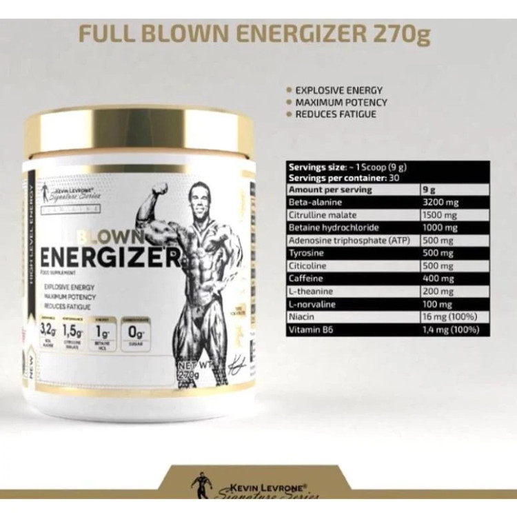 انرژایزر فول بلون. مکمل غذایی. با شیرین کننده ها حاوی کافئین (200 میلی گرم در هر وعده 4.5 گرم؛ 400 میلی گرم / وعده روزانه 9 گرم). برای کودکان و زنان باردار توصیه نمی شود. Full Blown Energizer برای بزرگسالان فعال بدنی، به ویژه کسانی که در جلسات تمرین قدرتی با شدت و حجم بالا شرکت می کنند، توصیه می شود.