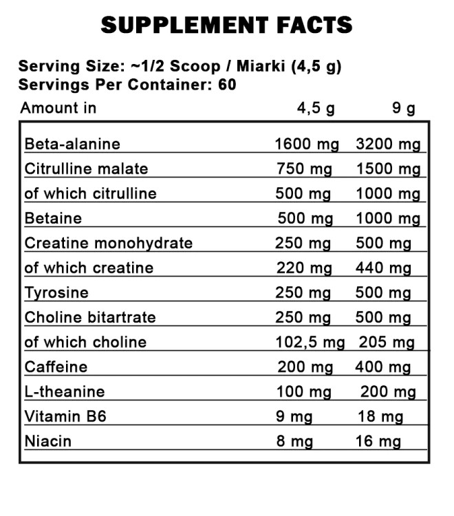 مواد تشکیل دهنده: بتا آلانین، سیترولین مالات، بتائین بی آب، کراتین مونوهیدرات، تیروزین، کولین بی تارتارات، عامل ضد تشکیل (E551)، طعم دهنده های 1،3 ، کافئین بی آب، طعم دهنده ها 2،4،5،6،7،8،11 , طعم دهنده 9 , تنظیم کننده اسیدیته (E330, E296)، طعم دهنده ها 10 ، ویتامین B6 (پیریدوکسین هیدروکلراید)، نیاسین (نیکوتینیک اسید)، نمک، کنسانتره آب چغندر قرمز 2،4،5،6،7،8،9،10،11 ، کنسانتره هویج سیاه 4،10 ، شیرین کننده ها (اسه سولفام K، سوکرالوز، گلیکوزیدهای استویول از استویا)، رنگ/ها [(E160a) 1،2،3،5،8 ، (E104) 1 ، (E132) 11 ]. E104: ممکن است اثر نامطلوبی بر فعالیت و توجه کودکان داشته باشد.