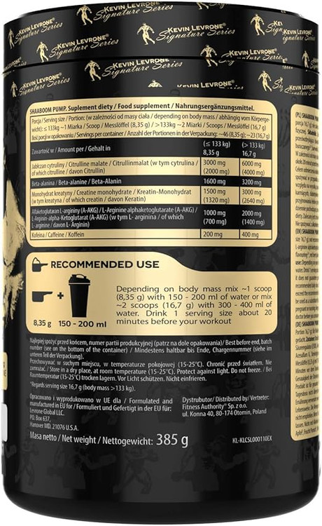 - 6000 میلی گرم سیترولین مالات، 3200 میلی گرم بتا آلانین، 2000 میلی گرم آرژنین AKG، 3000 میلی گرم کراتین مونوهیدرات، 400 میلی گرم کافئین در یک وعده