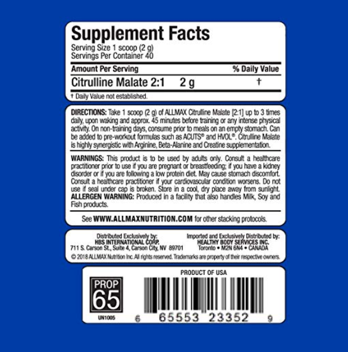 1 پیمانه (2 گرم) سیترولین مالات ALLMAX [2:1] را تا 3 بار در روز، پس از بیدار شدن و تقریباً مصرف کنید. 45 دقیقه قبل از تمرین یا هر گونه فعالیت بدنی شدید. در روزهای غیر تمرینی، قبل از غذا با معده خالی مصرف کنید. می تواند به فرمول های قبل از تمرین مانند ACUTS و IMPACT PUMP اضافه شود. سیترولین مالات با مکمل های آرژنین، بتا آلانین و کراتین هم افزایی بالایی دارد.