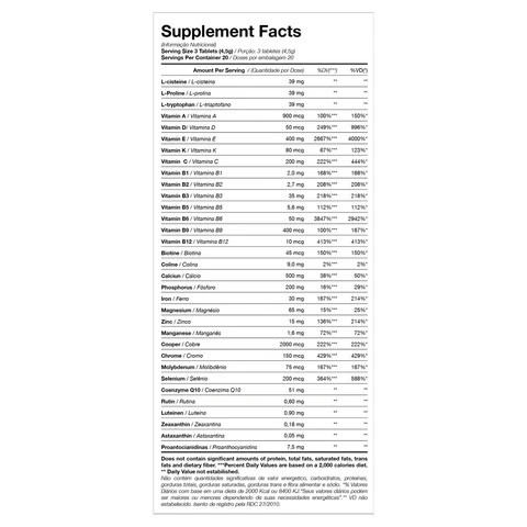 تورین، ال-سیستئین، ال-کارنیتین، ال-لوسین، ال-ایزولوسین، ال-والین، سرین، رتینول استات، کوله کلسیفرول، اسید اسکوربیک، توکوفرول استات، تیامین مونونیترات، ریبوفلاوین، نیکوتین آمید، هیدروکلراید فولیکوکوبآمین، فولیکولیک اسید فیتومنادیونا، بیوتین، پانتوتنات کلسیم، کربنات کلسیم، پیروفسفات آهن، فسفات منیزیم دی بازیک، سولفات روی مونوهیدرات، یدید پتاسیم، فسفات کلسیم دی بازیک، بیتارارات تپهای، سدیم بیهیدرات سوپرات، سوپر بیهیدرات پیکولینات، سولفات منگنز مونوهیدرات، لیکوپن مصنوعی، زآگزانتین، استات های اوستاکسانتین هماتوکوکوس پلویالیس، پودر کرن بری، پودر گوارانا، سلولز میکروکریستالی تثبیت کننده، دی اکسید سیلیکون ضد پت، تثبیت کننده کراسکارملوز سدیم و روان کننده استئارات منیزیم. حاوی گلوتن نباشد.