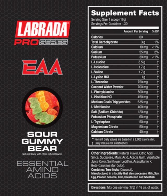 مقدار مصرف: یک مقدار (17 گرم) از EAA Labrada Pro Series را در 500 میلی لیتر آب مخلوط کنید.
