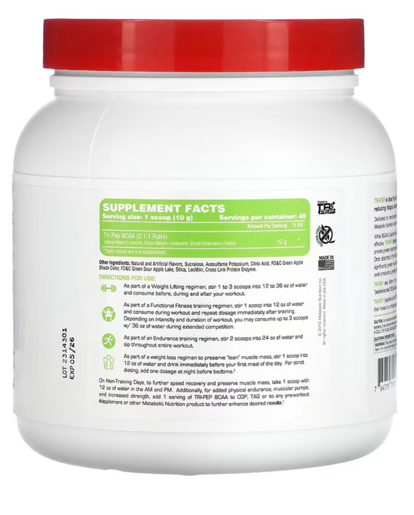 متابولیک نوتریشن که به تولید مکمل های غذایی فرموله شده توسط پزشک، با حمایت تحقیقات علمی و فرموله شده توسط پزشک اختصاص دارد، اولین شرکتی است که TRI-PEP را توسعه داده و معرفی کرده است ... تنها BCAA با پیوند پپتیدی طراح در بازار. در حالی که BCAA [لوسین، ایزولوسین، و والین) ضروری هستند... BCAAهای آزاد معمولی، فاکتورهای کمکی حیاتی برای موثر کردن متابولیسم BCAA ندارند. BCAA "پیوند پپتیدی" TRI-PEP حاوی نسبت صحیح این فاکتورهای متابولیکی حیاتی در ساختار شیمیایی منحصر به فرد خود است تا جذب و فراهمی زیستی بیشتر را فراهم کند ... بنابراین، غلظت آمینوهای پلاسمایی خون را افزایش می دهد که منجر به اشباع بیشتر BCAA عضلانی می شود. BCAA "پیوند پپتیدی" TRI-PEP پس از جذب در جریان خون، سطح گلیکوژن عضلانی را افزایش می دهد و از تجمع اسید لاکتیک جلوگیری می کند و در عین حال از تجزیه بافت عضلانی بدون چربی جلوگیری می کند. TRI-PEP علاوه بر این از بهبود سنتز پروتئین، تولید اکسید نیتریک، سطح هورمون رشد و آزادسازی IGF-1 برای حفظ و تقویت عضلات بدون چربی پشتیبانی می کند.