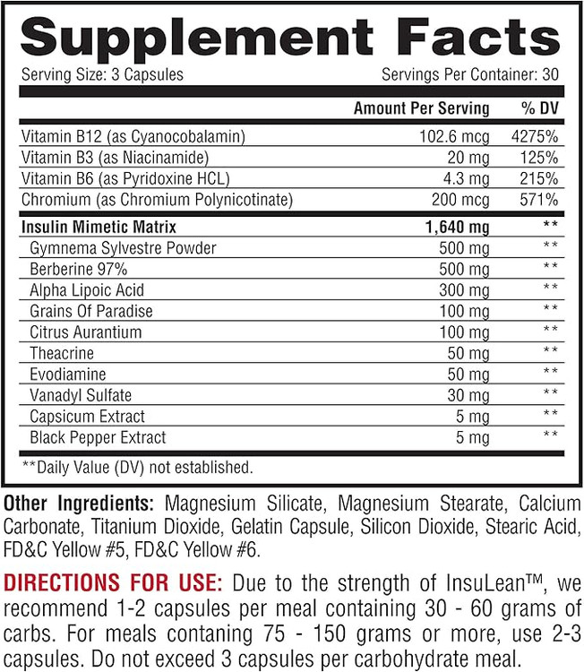 با توجه به قدرت InsuLean™، توصیه می کنیم 1-2 کپسول در هر وعده غذایی حاوی 30 تا 60 گرم کربوهیدرات باشد. برای وعده های غذایی حاوی 75 تا 150 گرم یا بیشتر، از 2 تا 3 کپسول استفاده کنید. از 3 کپسول در هر وعده کربوهیدرات تجاوز نکنید.