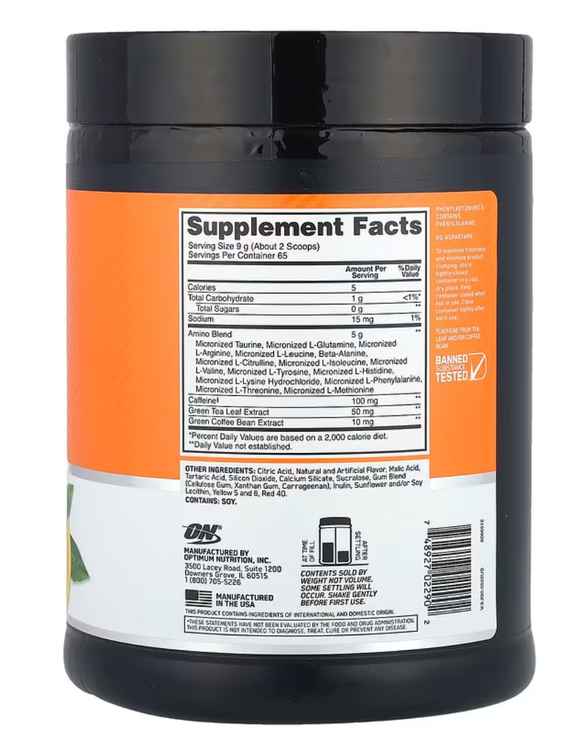 یک وعده از آمینو انرژی ضروری، انرژی و هوشیاری را با ۱۰۰ میلیگرم کافئین از منابع طبیعی و طعمی بینظیر که مشتاقانه منتظر مخلوط کردن آن با آب سرد در هر زمان هستید، افزایش میدهد. یک وان ۶۵ وعدهای را به باشگاه یا محل کار خود ببرید - هر کجا که روز شلوغتان شما را میبرد.