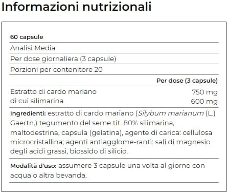 پودر برگ و دانه خار مریم (Silybum marianum Gaertn.)، عصاره دانههای خار مریم (Silybum marianum Gaertn.). ۸۰٪ سیلیمارین، کپسول: ژلاتین، عامل حجمدهنده: سلولز میکروکریستالی، عوامل ضد کلوخه شدن: استئارات منیزیم، دیاکسید سیلیکون.
