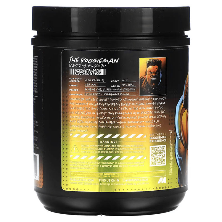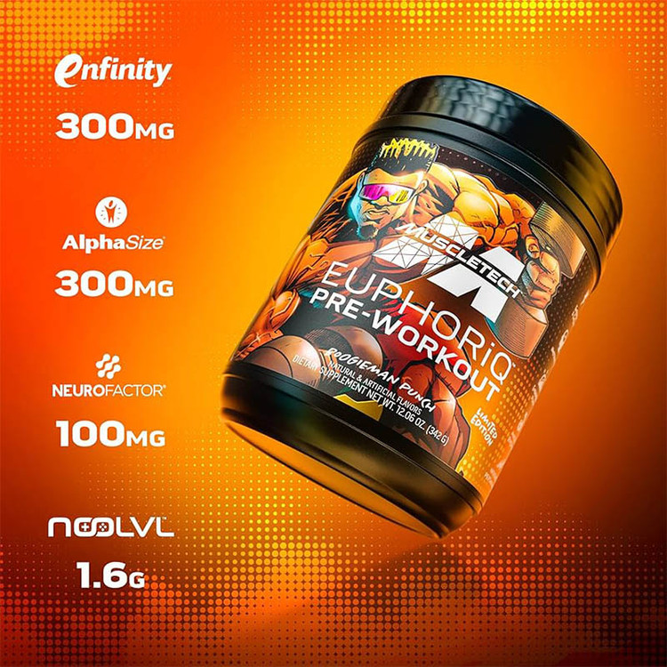 مکمل پیش از تمرین EuphoriQ™ که با محرک بسیار تکاملیافته Enfinity® تقویت شده است، سطوح بالایی از انرژی پاک و روان را آزاد میکند که به وزنهبرداریهای سنگین بوگیمن در باشگاه سوخترسانی کرده و به شدت بیوقفه او قدرت میبخشد. بوگیمن همچنین از قدرت عضلهسازی و افزایش عملکرد ناشی از بتائین و بتاآلانین موجود در EuphoriQ™ بهرهمند میشود و در عین حال پمپهای عضلانی شگفتانگیز ناشی از L-citrulline و Noolvl® را نیز تجربه میکند.