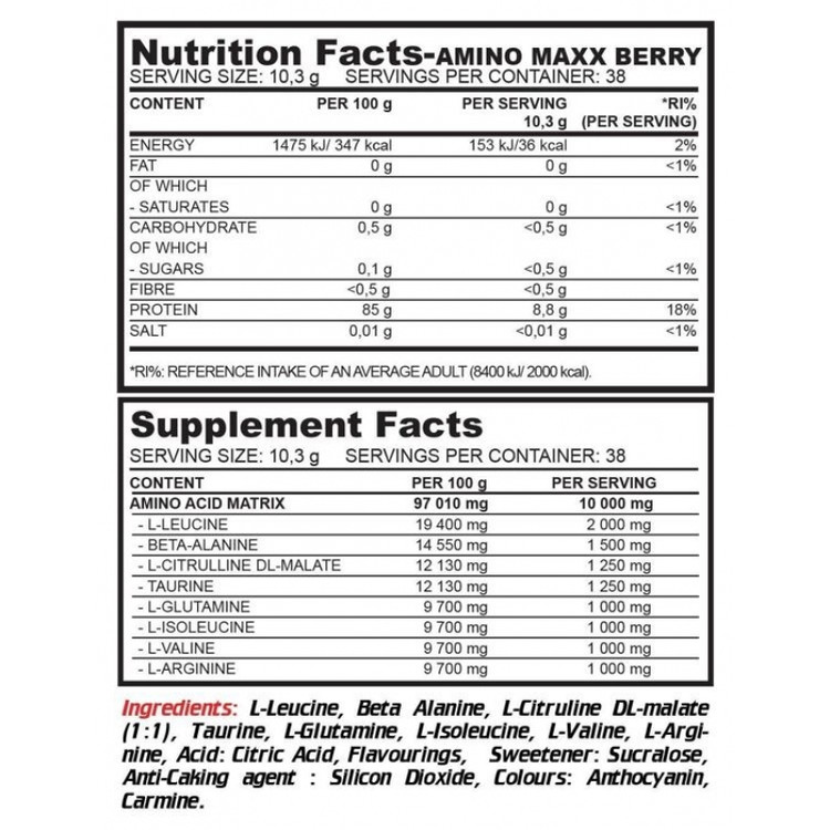 AMINO MAXX تقریبا 10000 میلی گرم ماتریس اسید آمینه ویژه را در هر وعده ارائه می دهد. ترکیب BCAA در نسبت 2:1:1، بتا آلانین، ال سیترولین، تائورین، ال گلوتامین و ال آرژنین، آن را به یکی از آن دسته از محصولات چند منظوره تبدیل می کند که ورزشکاران می توانند در موارد مختلف از آن استفاده کنند. این که آیا شما نیاز به مصرف بعد از ظهر دارید، یا می خواهید از آن در طول تمرین برای کمک به حفظ شدت استفاده کنید فرقی ندارد می توانید از این محصول برای همه این موارد استفاده کنید. بهتر از همه، این یک محصول کم کالری است که فقط 36 کیلو کالری در هر وعده ارائه می دهد. بنابراین می توانید لاغر بمانید و به ساخت عضله کمک کنید.