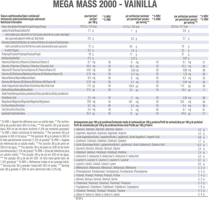 زمانه عوض میشود و علم پیش میرود. مگا مس ۲۰۰۰ با زمانه جدید سازگار میشود تا همچنان بهترین محصول را برای ساخت توده و حجم عضلانی به شما ارائه دهد. ویژگیهای اصلی مگا مس ۲۰۰۰ جدید: ۶۷٪ کربوهیدرات: یک "گینر" مانند مگا مس ۲۰۰۰. عمدتاً از یک ماتریس کربوهیدرات متشکل از: مالتودکسترین ذرت، نشاسته گندم بومی، بلغور جو دوسر کامل، نشاسته ذرت و نشاسته سیبزمینی تهیه شده است. این ترکیب جدید باعث میشود که میزان قند تا ۷٪ از ترکیب آن به طور قابل توجهی کاهش یابد. ۱۹٪ پروتئین: عمدتاً از ترکیبی از کنسانتره و وی ایزوله تهیه شده است. با توجه به اهمیت پروتئین در رشد عضلات و پیشرفت در تحقیقات ترکیبات، مگا مس ۲۰۰۰ منابع پروتئینی بهبود یافتهای را برای یک گرم آمینوی کاملتر ارائه میدهد. به این ترتیب، علاوه بر تأمین مواد مغذی انرژی، بازسازی و رشد عضلات را تسهیل میکند. تورین: اسید آمینه فرآیندهای جذب مواد مغذی را بهبود میبخشد. ویتامینها و مواد معدنی: ویتامین و مواد معدنی پیچیده برای بهینهسازی عملکرد انرژی ورزشکار و تأمین نیازهای روزانه آنها. ورزشکارانی که میخواهند توده عضلانی خود را افزایش دهند، از اهمیت کالری دریافتی در یک ورزشکار آگاه هستند. (مگا مس قدیمی) بدون کراتین. بدون آسپارتام. مگا مس ۲۰۰۰ انرژی مورد نیاز شما را برای رسیدن به هدفتان فراهم میکند و پروتئین و سایر مواد مغذی را که حالت آنابولیک متابولیسم را تقویت میکنند، برای شما به ارمغان میآورد. مگا مس ۲۰۰۰ بدون شک مکمل ایدهآلی برای افزایش توده عضلانی بدون چربی بدون افزایش توده چربی است، اعتماد به نفس وزنهبردار شما همیشه با پیشرفتهای تغذیهای امروزی همراه است.