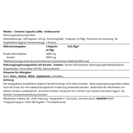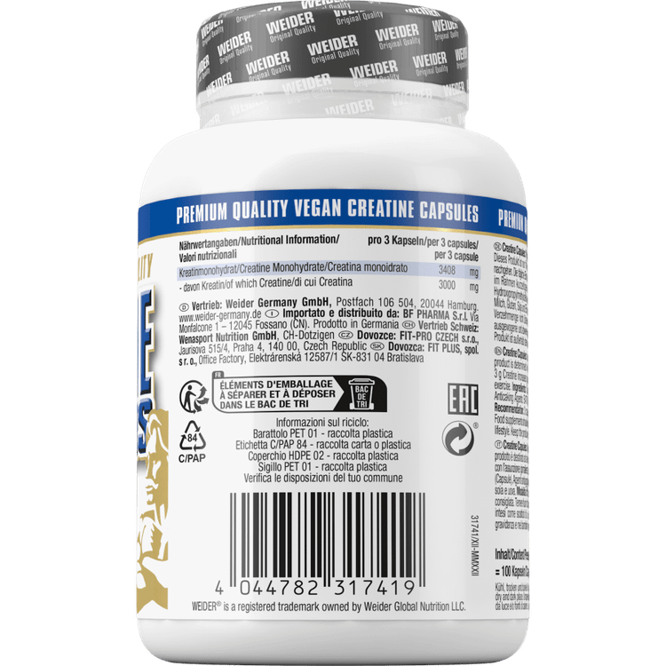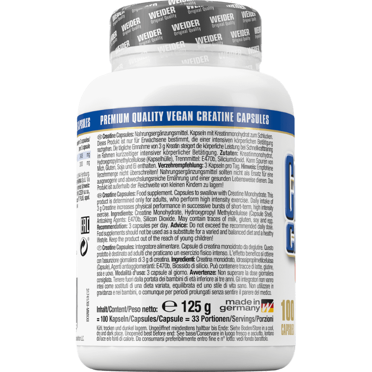 ۳ کپسول کراتین ویدر کریپور را در ۰.۳ لیتر مایع (ترجیحاً آب انگور) حل کنید و قبل از صبحانه بنوشید یا سه کپسول کراتین ویدر کریپور را با کمی مایع (ترجیحاً آب انگور) بعد از تمرین مصرف کنید. دوره مصرف: ۶ تا ۸ هفته، سپس قبل از شروع دوره جدید کراتین، دو تا چهار هفته استراحت کنید. با مصرف کراتین ویدر پیور، ذخایر کراتین در عضله تمرین کرده میتواند دوباره پر شود. این به شما امکان میدهد تمرینات خود را فشردهتر کنید و فشار بیشتری به عضلات خود وارد کنید. یک اثر جانبی مثبت: عضلات شما سفتتر به نظر میرسند! کراتین پیور مکملی است که در حال حاضر به بسیاری از ورزشکاران کمک کرده است تا در کنار تمرینات سنگین به موفقیت برسند.