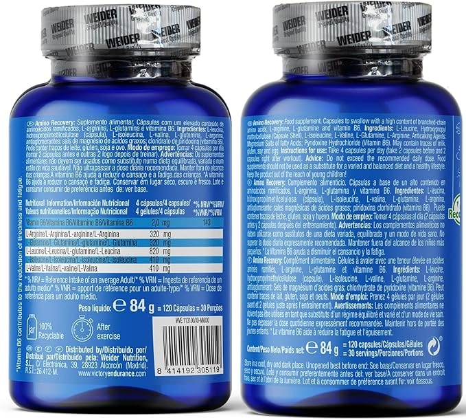 - استقامت ویکتوری ریکاوری آمینو را توسعه داده است که علاوه بر کمک به ریکاوری ما، یک عمل سمزدایی نیز انجام میدهد. Bcaaها اسیدهای آمینه شاخهدار لوسین، ایزولوسین و والین هستند. که دارای خواص انرژی و ریکاوری هستند. قبل از تمرین، از توده عضلانی محافظت میکنند و همچنین در ورزشهای استقامتی، به ما انرژی میدهند و از مصرف گلیکوژن عضلانی جلوگیری میکنند و بنابراین خستگی را به تأخیر میاندازند. پس از تمرین، به دلیل اثر عضلهسازی خود، بهبود آسیب عضلانی ناشی از تمرین شدید را تسریع میکند. ال-آرژنین از جمله خواص این اسید آمینه، یکی از مهمترین آنها شرکت در فرآیندهای سمزدایی است، زیرا در چرخه اوره شرکت میکند که برای از بین بردن سمومی که در طول تمرین ورزشی تولید میشوند ضروری است. همچنین، در طول تمرین، در گشاد شدن عروق (افزایش جریان خون) شرکت میکند که انتقال اکسیژن و مواد مغذی به عضلات را تسهیل میکند. همچنین به دلیل عملکرد مطلوب بر متابولیسم پروتئینها، اثر ریکاوری دارد. ال-گلوتامین اسید آمینه ضروری برای محافظت و ترمیم بافت عضلانی است. به ریکاوری عضلات و گلیکوژن کمک میکند. همچنین عملکرد سیستم ایمنی را افزایش و بهبود میبخشد و "سندرم تمرین بیش از حد" (Ots) را کاهش میدهد. ویتامین B6 در متابولیسم اسیدهای آمینه و پروتئینها اساسی است. ترکیبات: ال-لوسین، ژلاتین، ال-ایزولوسین، ال-والین، ال-آرژنین، ال-گلوتامین، عامل ضد چسبندگی: منیزیم استئارات پیریدوکسین هیدروکلراید (ویتامین B6)، رنگها: E171، E104. E104: ممکن است اثرات منفی بر فعالیت و توجه کودکان داشته باشد. دستورالعمل: 2 کپسول قبل و 2 کپسول بعد از تمرین مصرف کنید.