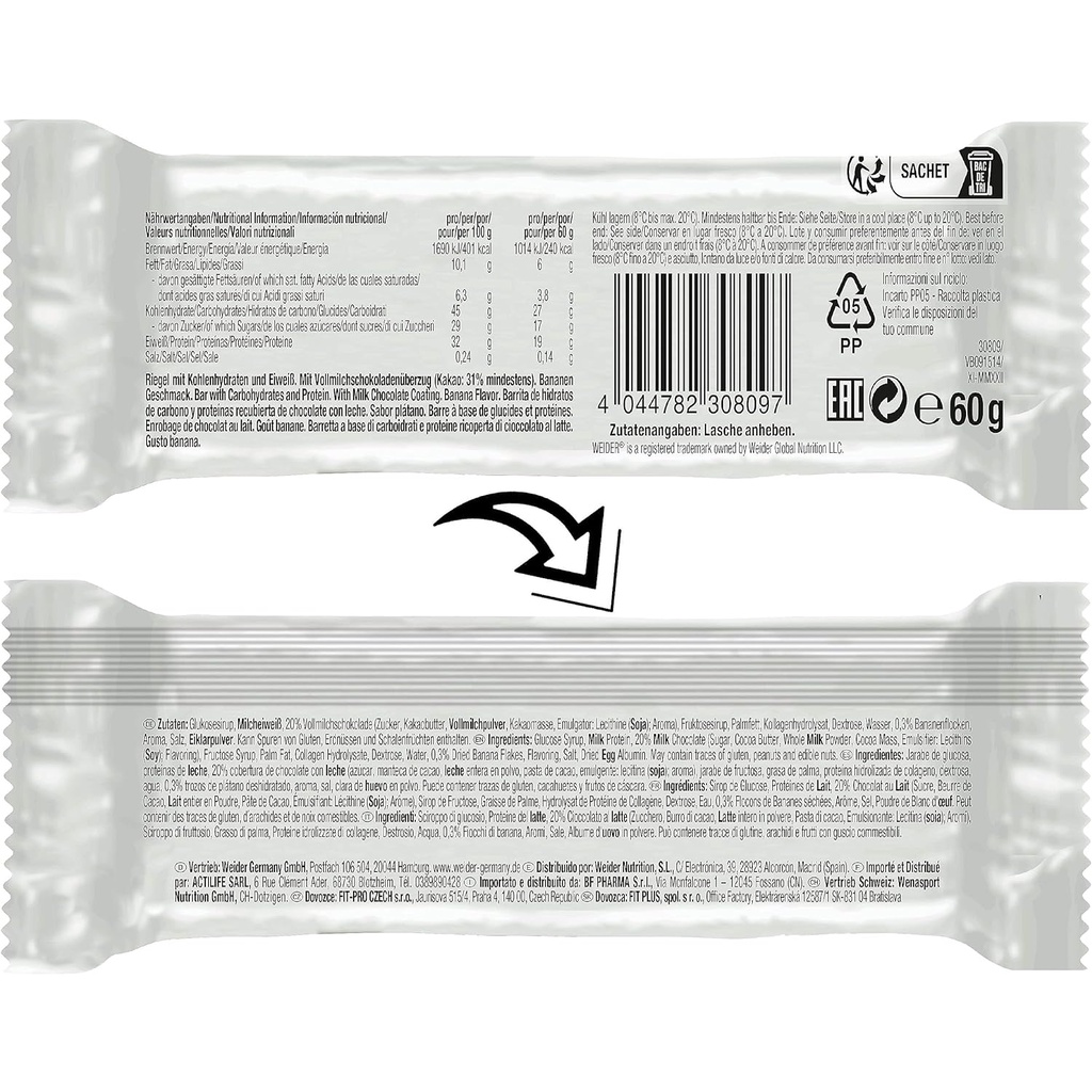 پروتئین بار 32% ویدر 60 گرمی یکی از محبوبترین پروتئین بارها در اروپا است. یک شکلات خوشمزه با ۳۲ درصد پروتئین ممتاز. بدون چربیهای سفتشده! شکلات پروتئینی ۳۲٪ - رتبه اول در بین شکلاتهای اروپایی، چه از نظر فروش و چه از نظر طعم! مواد تشکیل دهنده: به ازای هر ۱ عدد، ۳۲٪ پروتئین بار: ۱۹ گرم پروتئین، ۲۷ گرم کربوهیدرات، ۵.۴ گرم چربی، ویتامینها: ۸ میلیگرم E، ۷۲ میلیگرم C، ۲.۴ میلیگرم B1، ۲.۴ میلیگرم B2، ۲.۴ میلیگرم B6، ۷.۲ میلیگرم اسید پانتوتنیک