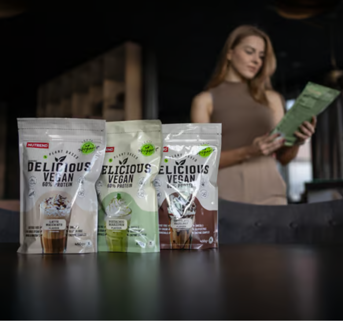 - هر ۱۰۰ گرم پروتئین وگان Nutrend Delicius حاوی تقریباً ۶۰ گرم پروتئین گیاهی است که با مواد مغذی مهم برای