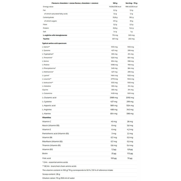 یک وعده (۷۰ گرم = ۲.۵ پیمانه) را در ۳۰۰ میلیلیتر آب مخلوط کنید. کمی (۱۰ تا ۲۰ دقیقه) پس از پایان تمرین مصرف کنید. بسته به رژیم غذایی خود، حداکثر دو بار در روز میل کنید.