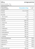 - مخلوط اسیدهای آمینه ضروری فوری (ال-لوسین، ال-لیزین هیدروکلراید، ال-ایزولوسین، ال-والین، ال-ترئونین، ال-متیونین، ال-فنیلآلانین، ال-تریپتوفان، امولسیفایر لسیتین آفتابگردان)، مالتودکسترین، تنظیمکننده اسیدیته اسید سیتریک، ال-هیستیدین، عصاره چای سبز (40٪ ال-تیانین)، تنظیمکننده اسیدیته اسید مالیک، طعمدهنده، سدیم کلرید، تثبیتکنندههای صمغ اقاقیا و زانتان، گلوکونات روی، سدیم سیترات، شیرینکنندههای سوکرالوز و استویول گلیکوزیدها، عامل ضد کلوخه شدن دیاکسید سیلیکون، کلسیم دی-پانتوتنات، کوله کلسیفرول، پیریدوکسین هیدروکلراید، عامل رنگ بتا کاروتن، سیانوکوبالامین