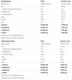 طعم پرتقال: ترکیبی از BCAA های فوری (ال-لوسین، ال-ایزولوسین، ال-والین، امولسیفایر لسیتین سویا )، ال-گلوتامین، تنظیم کننده اسیدیته اسید سیتریک، طعم دهنده، شیرین کننده های سوکرالوز و آسه سولفام پتاسیم، عوامل ضد کلوخه شدن کلسیم فسفات و سیلیس، بتاکاروتن به عنوان رنگ دهنده.