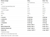 انبه: مخلوطی از BCAA فوری (ال-لوسین، ال-ایزولوسین، ال-والین، امولسیفایر لسیتین آفتابگردان)، ال-گلوتامین، تنظیم کننده اسیدیته اسید سیتریک، طعم دهنده، شیرین کننده ها آسه سولفام پتاسیم و سوکرالوز، کنسانتره گلرنگ، عوامل ضد کلوخه شدن کلسیم فسفات و دی اکسید سیلیکون، گلوکونات روی، نیکوتین آمید، پیریدوکسین هیدروکلراید، تیامین هیدروکلراید، رنگ بتاکاروتن. این محصول ممکن است حاوی مقادیر کمی پروتئین سویا و شیر باشد .