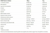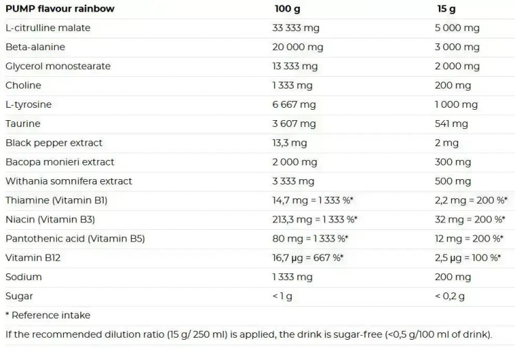 ارزشهای غذایی: ۱۰۰ گرم ۱۵ گرم ال-سیترولین مالات ۳۳,۳۳۳ میلیگرم ۵۰۰۰ میلیگرم بتا آلانین ۲۰۰۰۰ میلیگرم ۳۰۰۰ میلیگرم گلیسرول مونو استئارات ۱۳۳۳۳ میلیگرم ۲۰۰۰ میلیگرم کولین ۱,۳۳۳ میلیگرم ۲۰۰ میلیگرم ال-تیروزین ۶,۶۶۷ میلیگرم ۱۰۰۰ میلیگرم تارین ۱,۷۰۳ میلیگرم ۲۵۶ میلیگرم عصاره فلفل سیاه ۱۳.۳ میلیگرم ۲ میلیگرم عصاره باکوپا مونیری ۲۰۰۰ میلیگرم ۳۰۰ میلیگرم عصاره ویتانیا سومنیفرا ۳,۳۳۳ میلیگرم ۵۰۰ میلیگرم تیامین (ویتامین B1) ۱۴.۷ میلیگرم = ۱۳۳۳٪* ۲.۲ میلیگرم = ۲۰۰٪* نیاسین (ویتامین B3) ۲۱۳.۳ میلیگرم = ۱۳۳۳٪* ۳۲ میلیگرم = ۲۰۰٪* اسید پانتوتنیک (ویتامین B5) ۸۰ میلیگرم = ۱۳۳۳٪* ۱۲ میلیگرم = ۲۰۰٪* ویتامین B12 ۱۶.۷ میکروگرم = ۶۶۷٪* ۲.۵ میکروگرم = ۱۰۰٪* سدیم ۱,۳۳۳ میلیگرم ۲۰۰ میلیگرم قندها <1 گرم <0.2 گرم ترکیب: