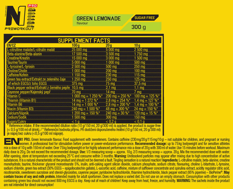 حداکثر غلظت مواد فعال در N1 PRO. این مکمل حرفهای قبل از تمرین، حداکثر تحریک بدن را قبل از تمرینات قدرتی یا قدرتی/استقامتی تضمین میکند. دوز بالای کافئین، تورین، عصاره چای سبز و ویتامینهای محرک گروه B، فعالیت شما را افزایش میدهد.