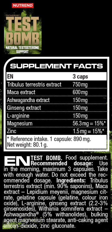 مکمل غذایی Nutrend Test Bomb حاوی عصارههای گیاهی مانند Tribulus terrestris، Maca، ginseng و ashwagandha KSM-66 است که با روی و منیزیم غنی شده است. تست بمب به طور خاص برای پشتیبانی از انرژی، نشاط و تعادل هورمونی طراحی شده است. این کمپلکس به عملکرد صحیح سیستم عصبی کمک میکند، از سنتز بهینه پروتئین و حفظ سطح طبیعی تستوسترون در خون پشتیبانی میکند. بمب تست ناترند انتخابی ایدهآل برای عضلات شماست.