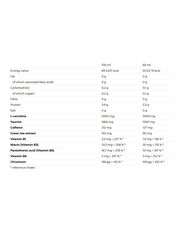 ۳۰۰۰ میلیگرم ال-کارنیتین به شکل مایع و با قابلیت جذب آسان. این محصول علاوه بر کافئین، با تورین و عصاره چای سبز غنی شده است. همچنین ویتامینهای B1، B3، B5، B6 را که به متابولیسم طبیعی انرژی کمک میکنند، برای شما فراهم میکند.