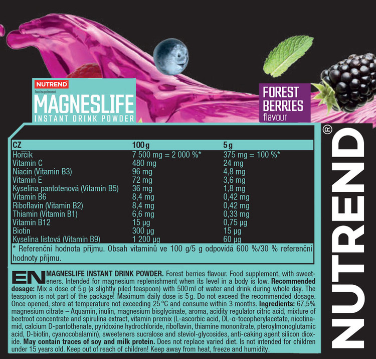 پودر نوشیدنی فوری NUTREND Magneslife حاوی نوعی منیزیم کاملاً قابل جذب در یک پیوند کلات شده است. منیزیم برای عملکرد بهینه عضلات، عملکرد صحیح سیستم عصبی و عملکردهای روانشناختی توصیه میشود.