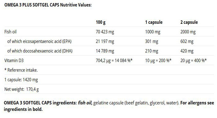 محصول کپسولهای نرم امگا ۳ حاوی روغن ماهی است که منحصراً از ماهی کولی گرفته شده است - ماهیای که در جریان پرو (هامبولت) صید میشود، که در سطح جهانی به عنوان پربارترین اکوسیستم دریایی شناخته میشود. روغن ماهی موجود در کپسولهای نرم منحصراً به شکل تری گلیسیریدهای قابل استفاده موجود است. اسیدهای چرب امگا ۳ بسیار غلیظ هستند و هر کپسول حاوی ۳۰۱ میلیگرم اسید چرب ایکوزاپنتانوئیک (EPA) و ۲۱۰ میلیگرم اسید چرب دوکوزاهگزانوئیک (DHA) است. اسیدهای چرب امگا ۳ ذکر شده در بالا، فعالیت مثبت مغز را تقویت میکنند، عملکرد قلب را حفظ میکنند و از بینایی پشتیبانی میکنند. اثرات مفید با مصرف روزانه ۲۵۰ میلیگرم EPA و DHA حاصل میشود.