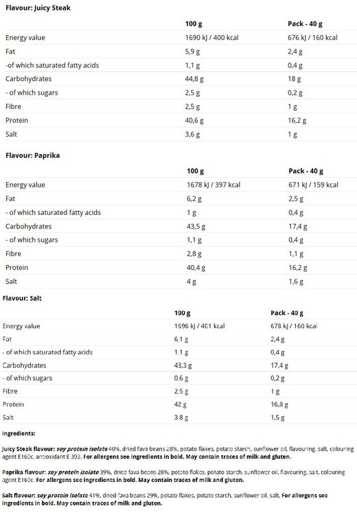 چیپس پر پروتئین نمکی - ترکیبات: پروتئین ایزوله سویا ۴۱٪، باقلا خشک ۲۹٪، پرک سیب زمینی، نشاسته سیب زمینی، روغن آفتابگردان، نمک. آلرژن ها در ترکیب برجسته شده اند. ممکن است حاوی مقادیر کمی شیر و گلوتن باشد.استیک چیپس با پروتئین بالا - مواد تشکیل دهنده: پروتئین ایزوله سویا ۴۰٪، باقلا خشک ۲۸٪، پرک سیب زمینی، نشاسته سیب زمینی، طعم دهنده، روغن آفتابگردان، نمک، رنگ E ۱۶۰c، آنتی اکسیدان E ۳۹۲. ممکن است حاوی مقادیر کمی شیر و گلوتن باشد.چیپس پاپریکا با پروتئین بالا - ترکیبات: ایزوله پروتئین سویا ۳۹٪، باقلا خشک ۲۸٪، پرک سیب زمینی، نشاسته سیب زمینی، طعم دهنده، روغن آفتابگردان، نمک، رنگ خوراکی E 160c. ممکن است حاوی مقادیر کمی شیر و گلوتن باشد.ارزشهای غذایی:طعم: نمک