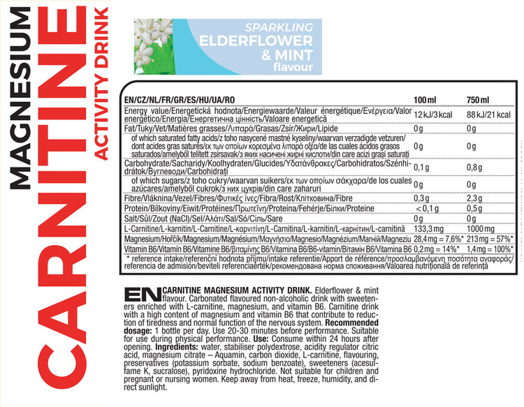 نوشیدنی فعالیت کارنیتین منیزیم به طور سنتی سهم بالایی از ال-کارنیتین با کیفیت (۱۰۰۰ میلیگرم) دارد. ال-کارنیتین مادهای است که به طور طبیعی در بدن وجود دارد و ارگانیسم قادر به تولید آن به مقدار مشخصی است. سنتز آن به وجود اسیدهای آمینه ال-لیزین و ال-متیونین و ویتامینهای B3، B6، C و آهن بستگی دارد. ال-کارنیتین انتقال اسیدهای چرب با زنجیره بلند (چربی) را به میتوکندری بهبود میبخشد، جایی که آنها "سوخته" شده و سپس به عنوان انرژی استفاده میشوند. ال-کارنیتین در رژیم غذایی برای فعالیتهای ورزشی قدرتی و همچنین برای ورزشهای استقامتی مناسب است.