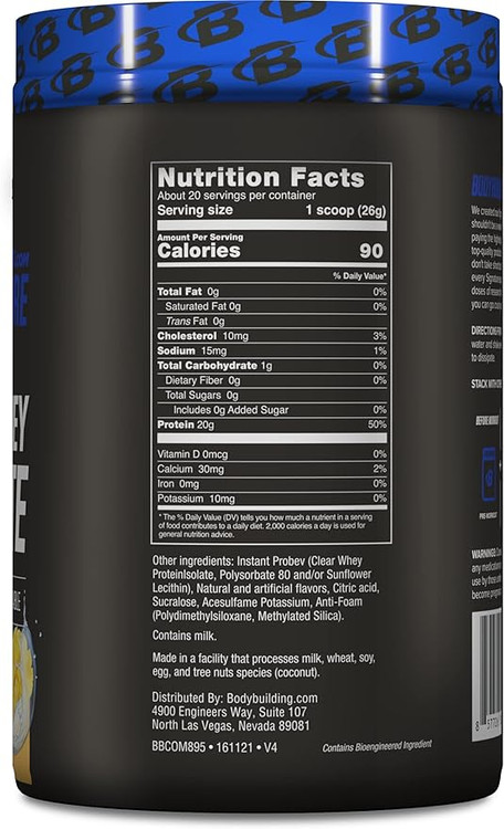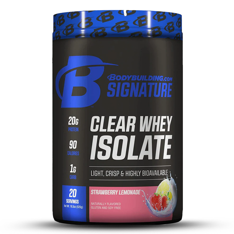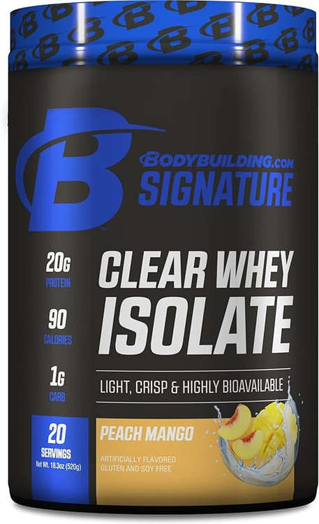 پروتئین وی ایزوله ۱۰۰٪ شفاف Bodybuilding.com در هر اسکوپ ۲۶ گرمی حاوی ۲۰ گرم پروتئین، ۱ گرم کربوهیدرات، ۰ گرم چربی و ۰ گرم شکر است. این پروتئین ایدهآل برای کسانی است که طعمهای سنتی بستنی شکلاتی و وانیلی را دوست ندارند. این محصول در طعمهای هلو، انبه، یخ هندوانه و لیموناد توتفرنگی عرضه میشود. مصرف پروتئین وی پس از تمرین به طور گسترده نشان داده است که قدرت، اندازه و عملکرد عضلات را افزایش میدهد و در عین حال به کاهش درد عضلانی و چربی بدن نیز کمک میکند. دلیل اثربخشی آن، مقدار بالای لوسین است که به طور خاص نشان داده است که تأثیر زیادی بر سنتز پروتئین و رشد عضلات دارد. یک اسکوپ ۲۶ گرمی پروتئین وی تقریباً ۳ گرم لوسین دارد که نشان داده است باعث ایجاد پاسخ آنابولیک میشود.