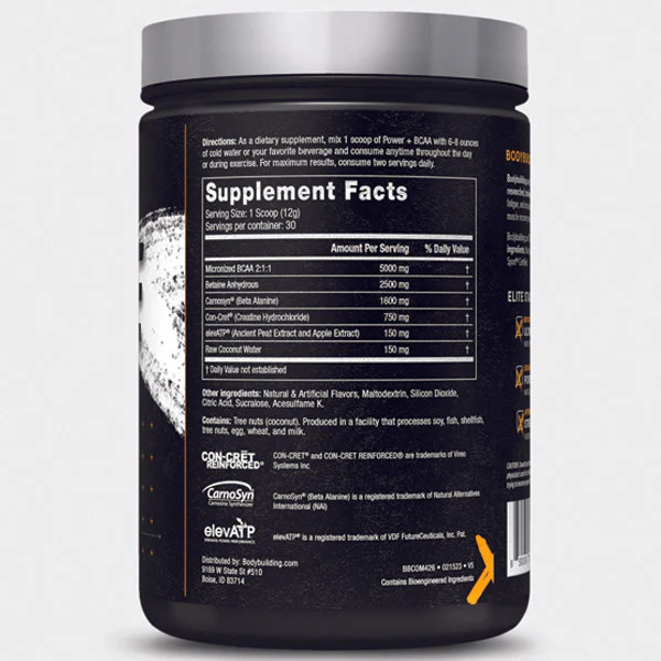 B BODYBUILDING.COM Elite Power + BCAA Blue Slushie ترکیبی از ۳ مادهی دارای علامت تجاری و دارای پشتوانه علمی است که شامل ۵ گرم BCAA، ۲.۵ گرم بتائین، ۱.۷ گرم بتا آلانین و ۷۵۰ میلیگرم کراتین هیدروکلراید برای به حداکثر رساندن ریکاوری، قدرت و استقامت میباشد. این فرمول تمیز و خوش طعم که با elevATP برای عملکرد و پودر آب نارگیل خام برای آبرسانی تقویت شده است، بدون رنگها یا رنگدانههای مصنوعی، به ورزشکاران نخبه سوخترسانی میکند