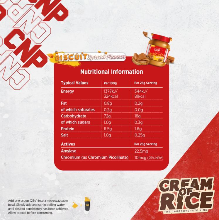 کرم برنج CNP از راه رسید! با تمام سیستمهای طعمدهنده فوقالعادهشان در پودرها و بارهای پروتئینیشان، اکنون در این سری کرم برنج گنجانده شدهاند ! یک وعده غذایی فوقالعاده قبل یا بعد از تمرین (یا فقط یک شروع عالی برای روز!)؛ کربوهیدرات، کربوهیدرات و کربوهیدرات بیشتر! همانطور که از روی بستهبندی پیداست، COR واقعاً "پادشاه کربوهیدرات" است ... اگر بخواهید، یک ماده آنابولیک ضروری! کرم برنج به خاطر هضم آسانش شناخته شده است، بنابراین چه به حجم کربوهیدرات نیاز داشته باشید و چه فقط یک صبحانه سبک و راحت!