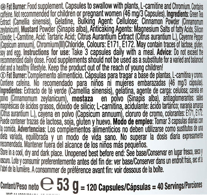 عصاره چای سبز، ژلاتین، سلولز (حجمدهنده)، پودر دارچین، پودر خردل، نمکهای منیزیم اسیدهای چرب، دیاکسید سیلیکون (ضد کلوخه شدن)، ال-کارنیتین، اسید تارتاریک (تنظیمکننده اسیدیته)، عصاره بهار نارنج، فلفل کاین، کلرید کروم، رنگها (E171، E172).