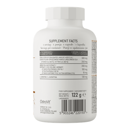 - منبع ترکیبات ارزشمند - یک وعده از مکمل غذایی، 300 میلیگرم اتیل استر اسید لینولئیک مزدوج CLA، و همچنین 200 میلیگرم عصاره برگ چای سبز استاندارد شده با 50٪ پلی فنول و 9٪ کافئین و 138 میلیگرم ال-کارنیتین را برای بدن فراهم میکند.
