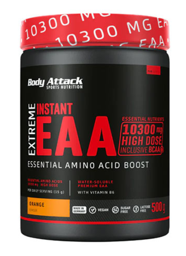 ترکیبات EAA فوری Extreme Instant: ال-لوسین (17.6%)، تنظیم کننده اسیدیته (اسید سیتریک)، ال-لیزین هیدروکلراید (13.4%)، ال-ایزولوسین (8.8%)، ال-والین (8.8%)، مالتودکسترین، ال-فنیل آلانین (7.1%)، ال-متیونین (6.4%)، ال-ترئونین (6.4%)، طعم دهنده، ال-تریپتوفان (1.7%)، رنگ (آنتوسیانین ها)، شیرین کننده ها (آسه سولفام پتاسیم، سوکرالوز)، عامل ضد کلوخه شدن (دی اکسید سیلیکون)، روغن گیاهی (نارگیل، پالم)، امولسیفایر (لسیتین آفتابگردان)، ویتامین B6.