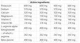 مالتودکسترین، دکستروز، سیترات پتاسیم (پتاسیم)، تنظیم کننده اسیدیته: اسید سیتریک؛ کلرید سدیم (سدیم)، پودر چغندر غلیظ، سیترات منیزیم (منیزیم)، کربنات کلسیم (کلسیم)، رایحه، ال-آرژنین آلفا کتوگلوتارات (AAKG)، بتا آلانین، اسید ال اسکوربیک (ویتامین C)، شیرین کننده: سوکرالوز. پیریدوکسین هیدروکلراید (ویتامین B6).